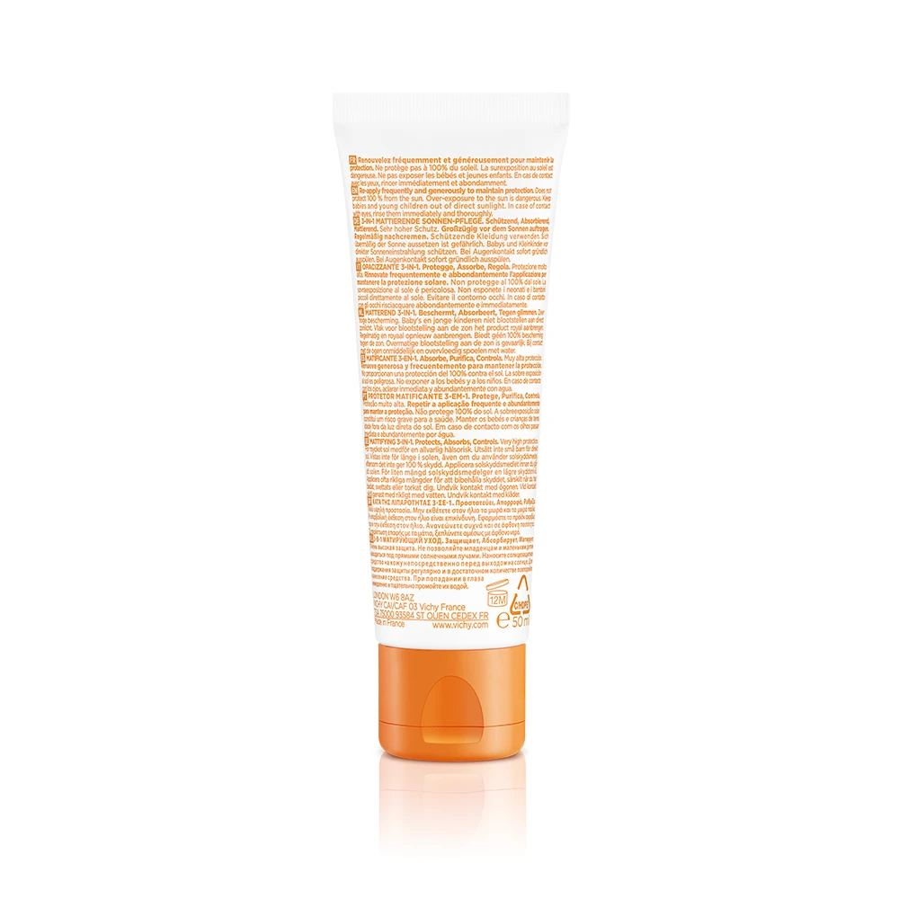 - offre un’elevata protezione solare SPF50+ grazie alla sua formula arricchita con filtri ad ampio spettro UVA/B abbinati all’acqua termale Vichy;