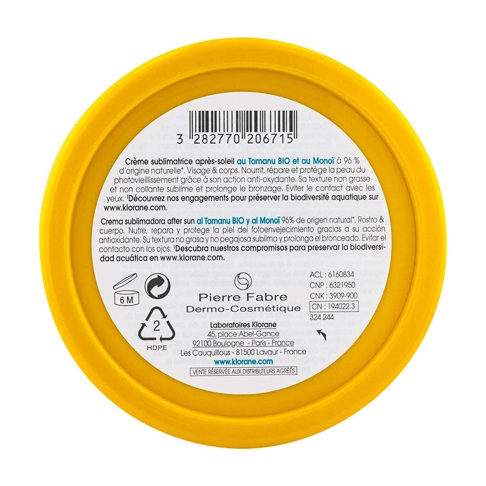 Questo prodotto nutre e ristruttura la pelle, lasciandola luminosa, morbida e sublimata, con una fragranza avvolgente e sensuale al Klorane al Tamanu Bio e al Monoï.