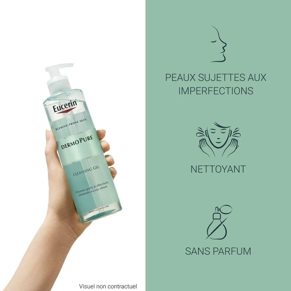 EUCERIN DermoPure Gel Detergente rimuove efficacemente e delicatamente l’eccesso di sebo, le impurità e il trucco, grazie alla sua formula senza sapone con il 6% di tensioattivi anfoteri.